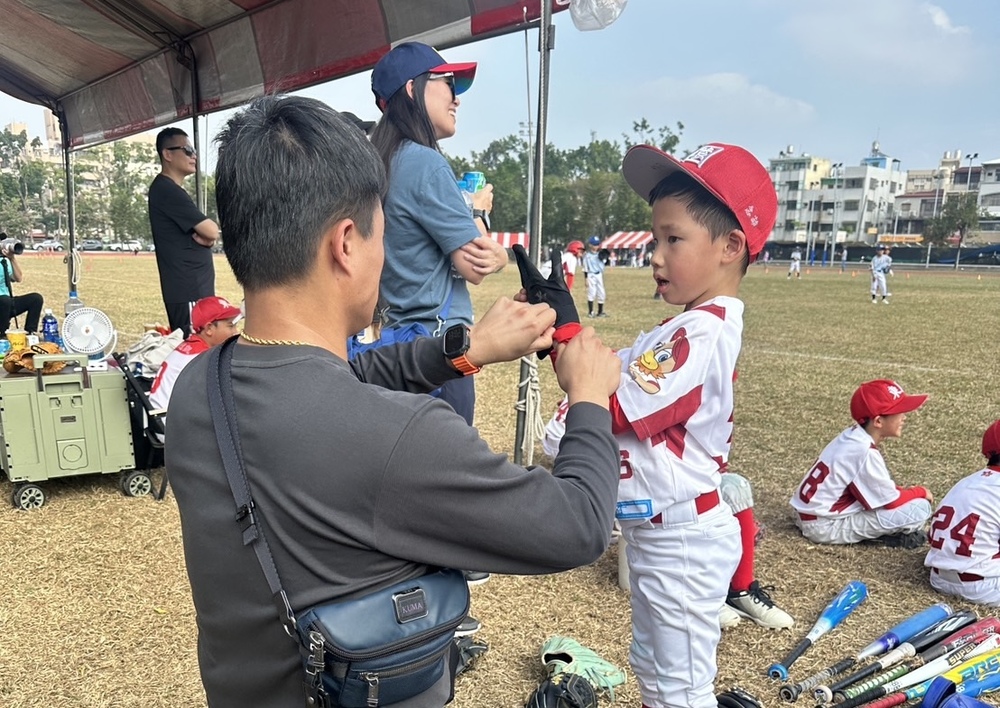 施子謙利用職棒休季期間參與到兒子的第一次比賽,覺得很感恩,還幫忙兒子整理裝備,他說,目前在台北訓練,有機會絕不能錯過,感謝東園教練報名這一隊,讓小朋友見見世面。