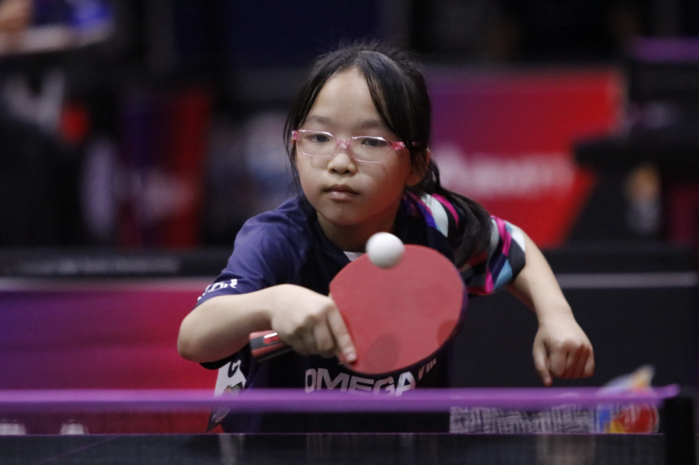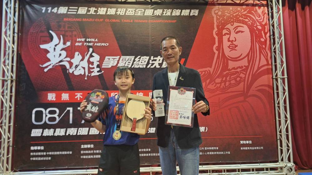 【姚瑞宸/雲林北港報導】代表「八馬國際」出征的張睿儀,今天在國小四年級女生單打賽中,連勝7場比賽,冠軍決賽以直落三(11比7、11比3、11比4)擊敗臺北市明湖國小王盈月,登上國小四年級女生單打的后座,連續第2年奪得「北港媽祖盃全國桌球錦標賽」冠軍,也是第一位在這項全國大賽衛冕成功的球員。