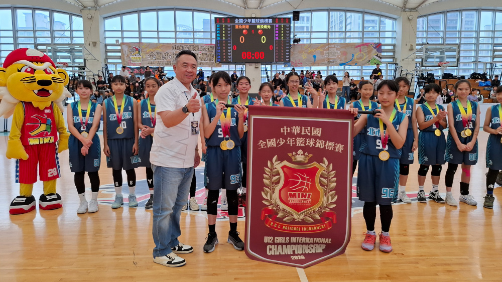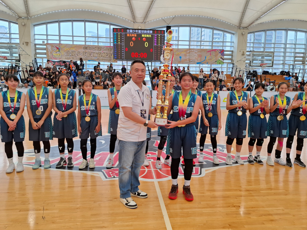 臺北市吳興國小在U12女子國際社區組封后,少年籃球發展協會理事長陳正玄頒發錦旗。
