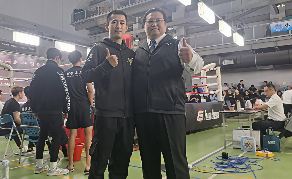 李展志(左)與中華民國踢拳道協會秘書長蔡豐穗合影。姚瑞宸攝