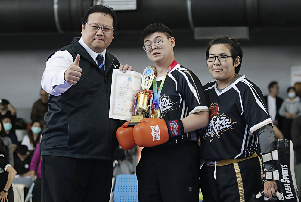 曾榮獲多屆全國中正盃泰拳錦標賽金牌,景文科大副研發長高崇倫博士,親赴現場為選手鼓勵,並捐贈300多條毛巾提供大會使用。
