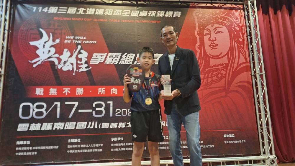 【姚瑞宸/雲林北港報導】臺北市明湖國小李杰昇,今(23)日在連勝7場,最後決賽以3:1力克臺北市民權國小陳彥廷,贏得「114年第三屆北港媽祖盃全國桌錦標賽」國小四年級男生單打賽的冠軍。